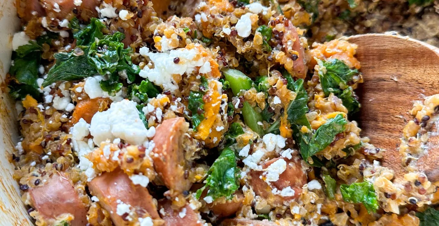 One-Pot Quinoa with Sweet Potato, Kale, and Chicken Sausage — The ideal mid-week dinner or meal prep! This recipe is full of creamy fall flavors, and is super easy to modify based on what you have in the fridge. Omit the goat cheese for a dairy-free option, or sub for a dairy-free soft cheese, I personally love the creaminess the cheese adds. This is the chicken sausage I always grab for and the pot I used!